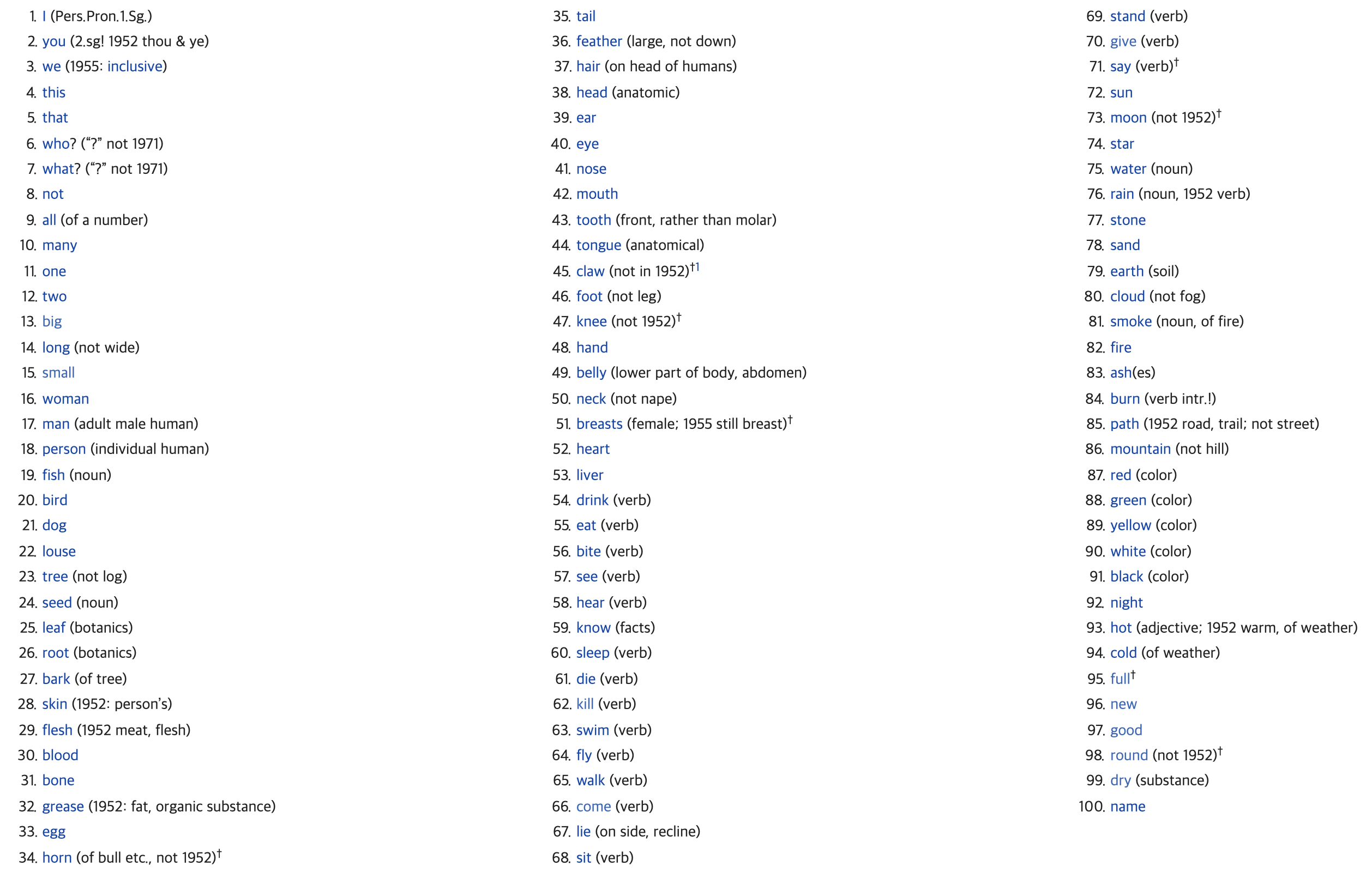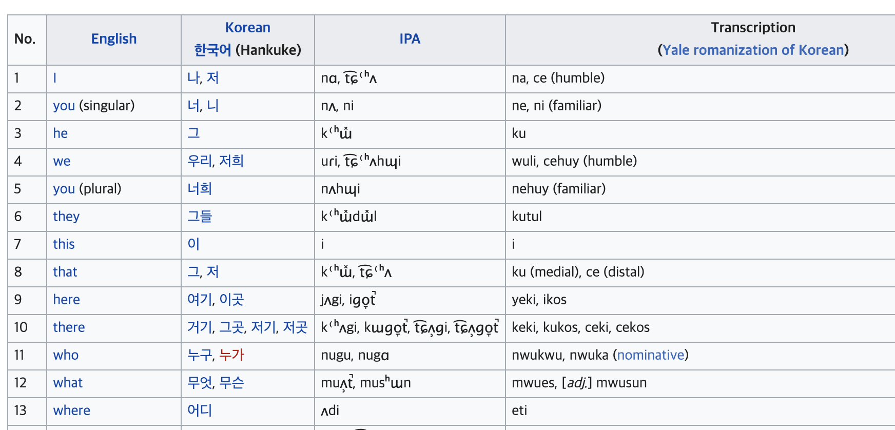한국어를 Swadesh로 정리하면 위의 테이블과 같다. IPA는 International Phonetic Alphabet의 약자로 국제적으로 정의한 발음 기호라고 이해하면 된다. Transcription은 발음을 고려하여 로마자로 변환한 것이다. 여러 언어를 비교하자면 이렇게 로마자로 변환하여 비교해야 한다. 그런데 이 어휘 리스트는 240개의 단어로 이루어져 있다.